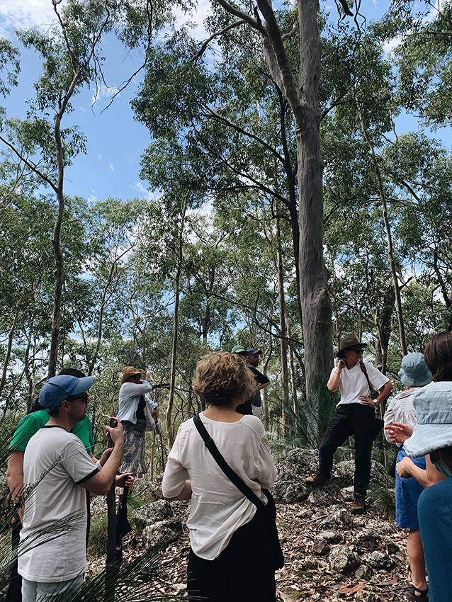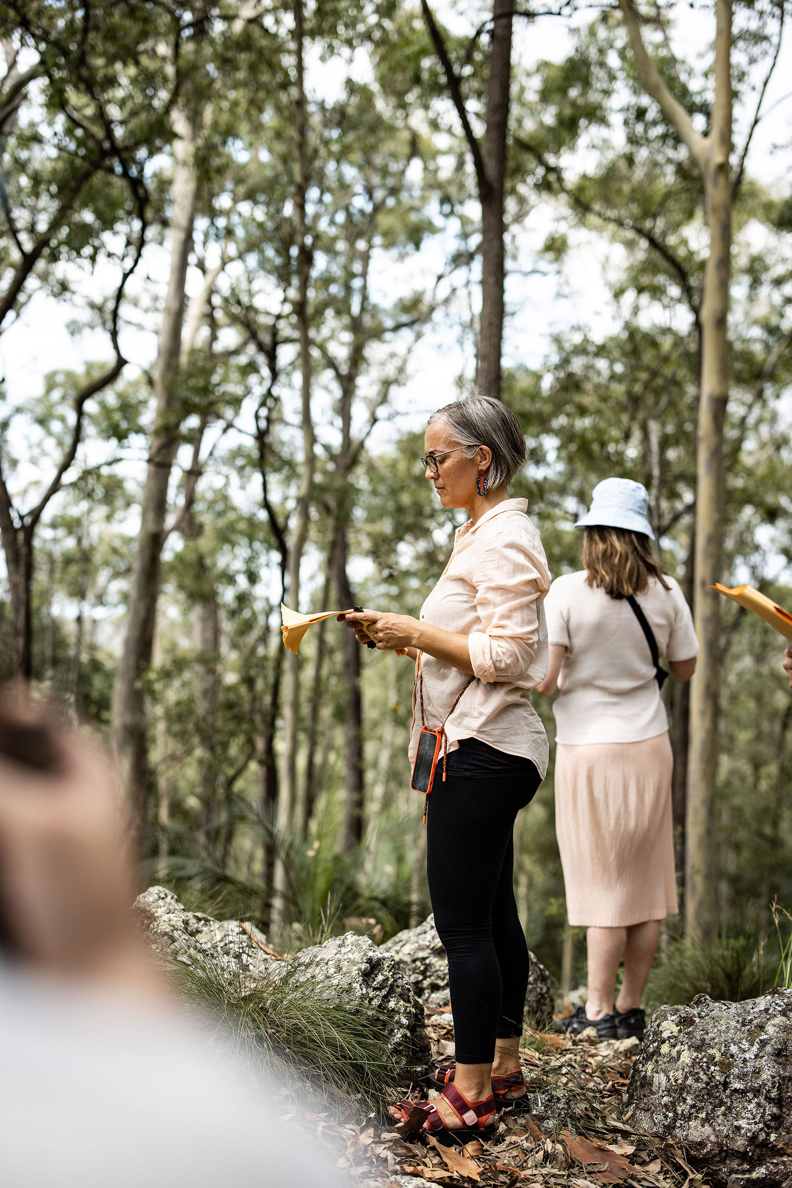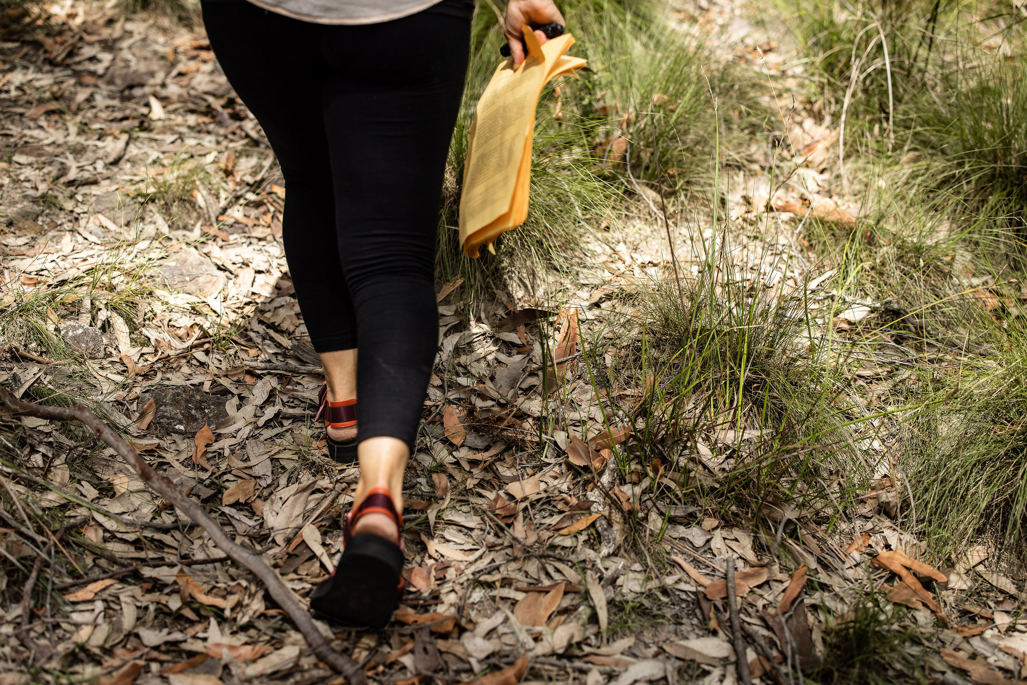 Walk: The work is framed through a performance-walk that tracks a circuit around the grounds at Bundanon — on lands of the Dharawal and Dhurga language groups — from the lowest reaches of the Shoalhaven River to the highest accessible elevation in the Spotted Gum Forest behind the museum. The walk pauses at 4 locations, while text-fragments written specifically for the occasion are performed: