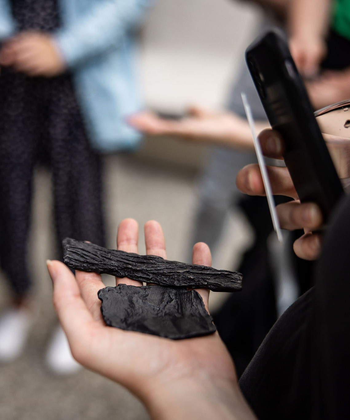 A set of bronze performance objects hand-moulded from wax that was worked into the crevices of silicone surfaces which were themselves pressed upon the fragments of fossils selected from the following sources: Plant fossils from the Permian and Triassic epochs held in the paleo-botanical archives of the Australia museum; My backyard in Wollongong, which sits on Permian epoch ground; Surfaces rocks from the cliffs that register the Permian-Triassic boundary and the third and largest mass extinction event on Earth; Contemporary anthropogenic surfaces at Bundanon as well as surfaces of living botanical forms found in the plant community of the Spotted Gum forest on the hill in the upper reaches of the Bundanon property. These objects are carried throughout the duration of the event, by the walking-participants.