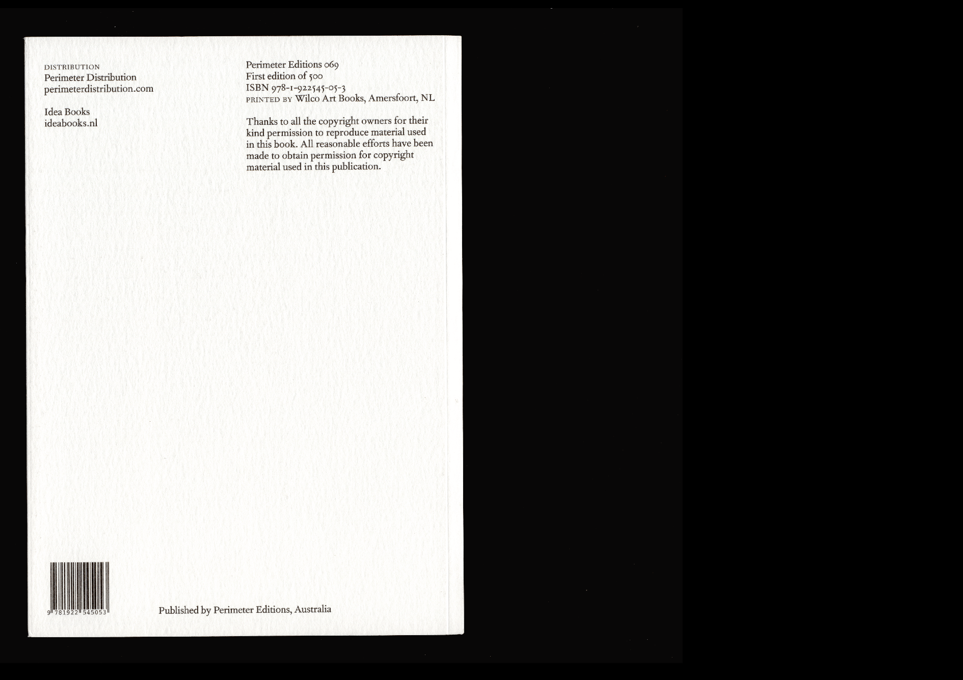 28 x 30cm, section sewn cold glue bound, softcover with flaps, Perimeter Editions (Melbourne).