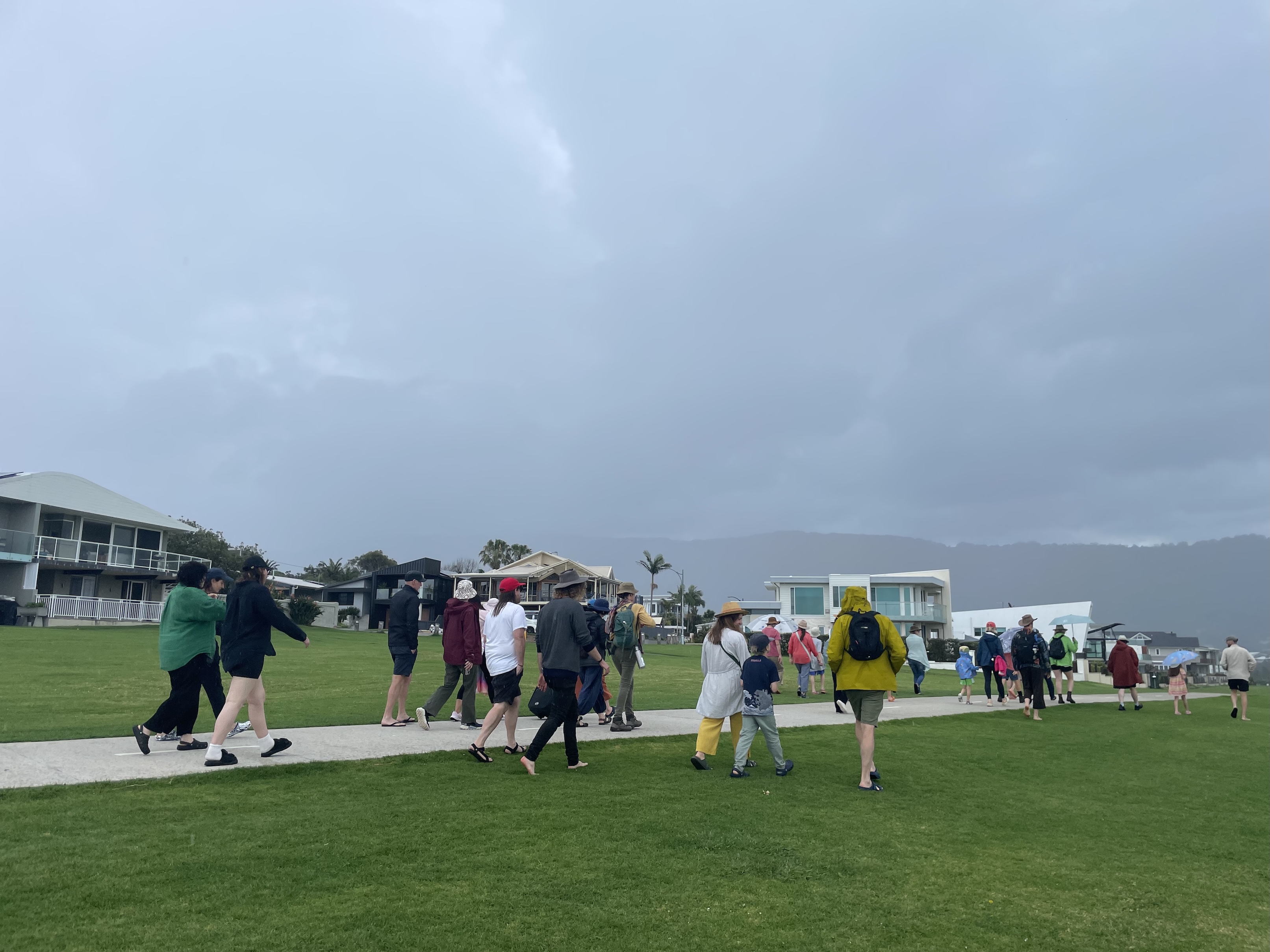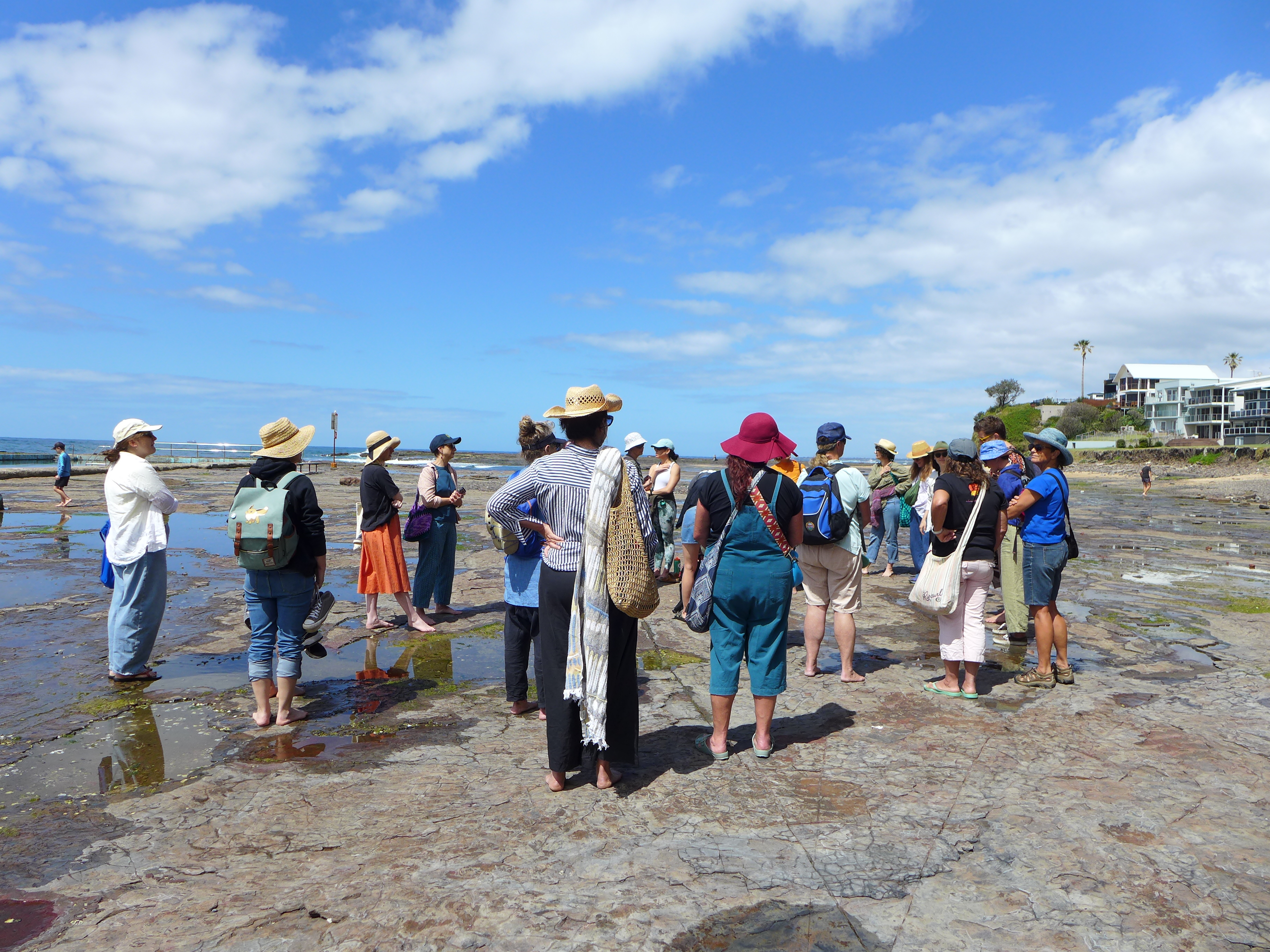 The Deep Time Coastline walking series invited participants to experience the Illawarra escarpment and coastline on Dharawal land through movement, conversation, and multisensory engagement. These walks unfolded as situated encounters with the region’s stratigraphic layers, ecologies, and cultural histories—tracing connections between ancient geological formations and contemporary climate challenges. Led by artists, curators, and knowledge holders, the series created space for shared learning and reflection in situ, foregrounding the ethical and aesthetic dimensions of walking as a collective method in place. Curated and produced by Bianca Hester and Bronwyn Bailey-Charteris in collaboration with Matt Poll, the walking series offered an embodied approach to understanding and caring for this complex landscape, cultivating attentiveness to its deep-time narratives and precarious futures.