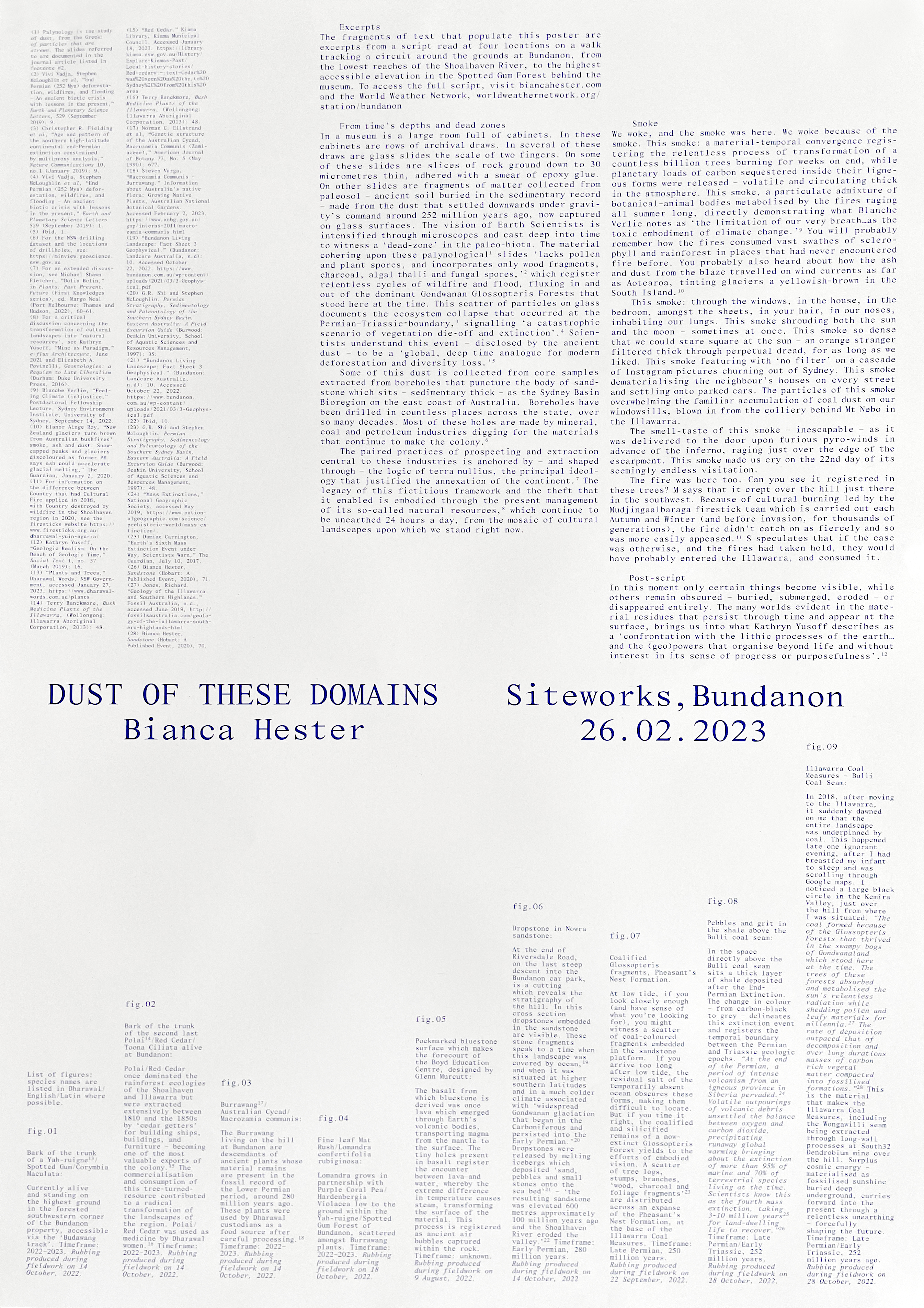 The walk pauses at four locations, while text-fragments written in response to the site are performed. Dust of these domains investigates the interdependence of colonial inheritance and extractive relations within the current climate crisis through embodied experiences within the Illawarra and Shoalhaven regions. It experiments with forms of relationality with non-human life within which human worlds are enmeshed to grapple with the instability of thought and materiality at the close of the Holocene, at an embodied, communal, and planetary scale.