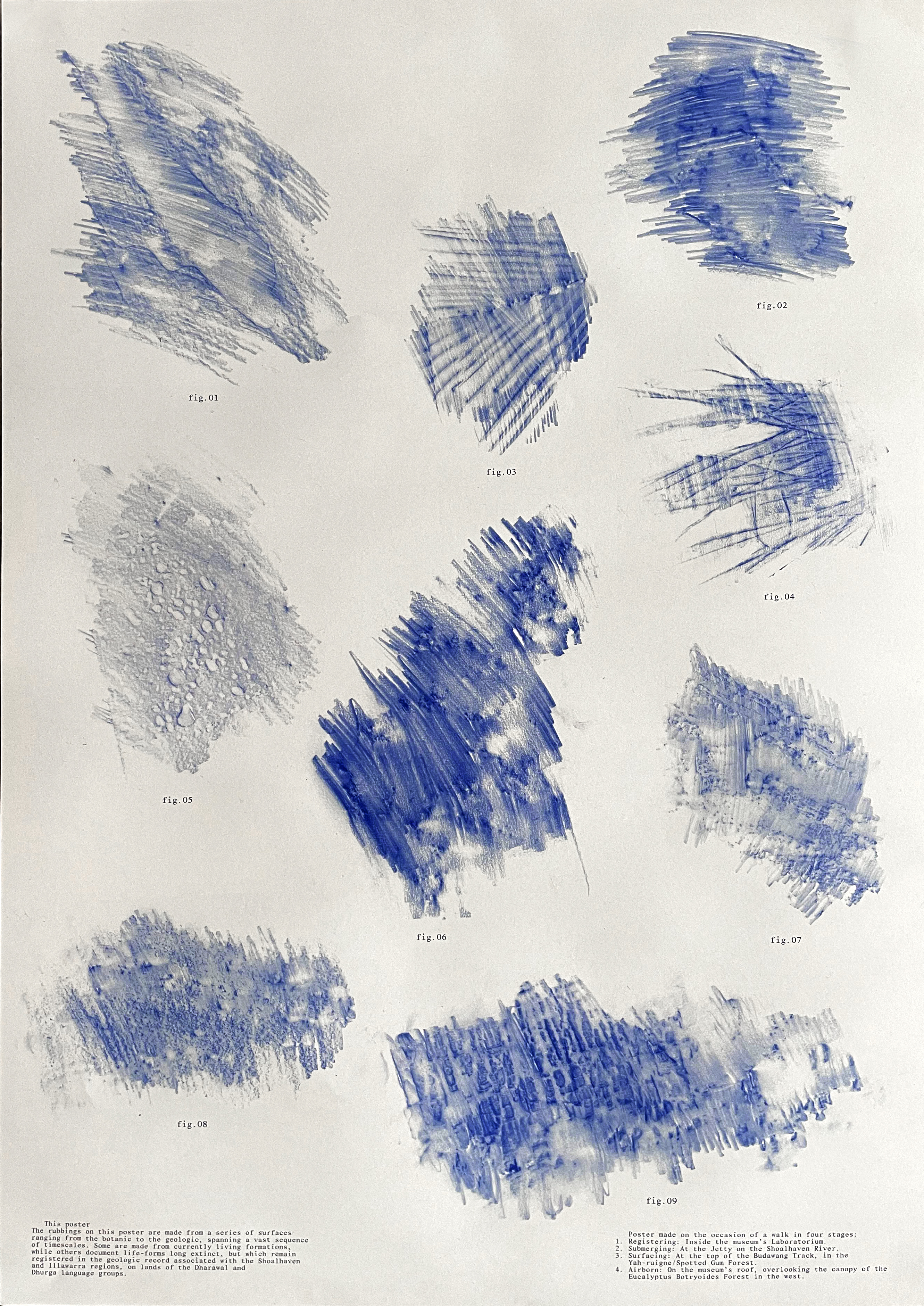 A poster made specifically for the event is composed of rubbings made from a series of surfaces ranging from the geologic to the botanical, spanning a vast sequence of timescales. Some are made from currently living formations, while others document life-forms long extinct, but which gave rise to geologic formations while remaining registered within them, such as Glossopteris leaves of Permian era forests of Gondwana.