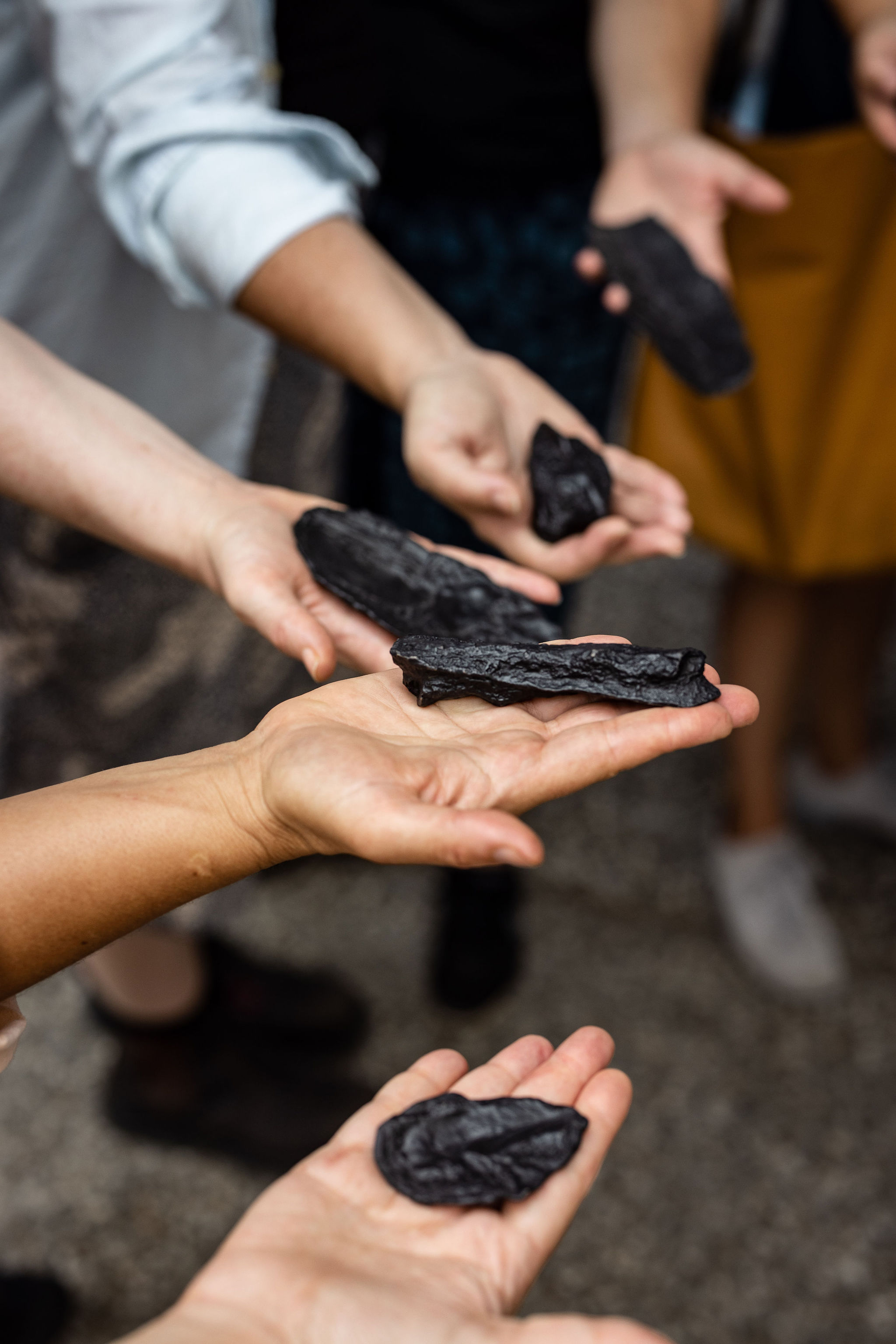 A set of bronze performance objects hand-moulded from wax that was worked into the crevices of silicone surfaces which were themselves pressed upon the fragments of fossils selected from the following sources: Plant fossils from the Permian and Triassic epochs held in the paleo-botanical archives of the Australia museum; My backyard in Wollongong, which sits on Permian epoch ground; Surfaces rocks from the cliffs that register the Permian-Triassic boundary and the third and largest mass extinction event on Earth; Contemporary anthropogenic surfaces at Bundanon as well as surfaces of living botanical forms found in the plant community of the Spotted Gum forest on the hill in the upper reaches of the Bundanon property. These objects are carried throughout the duration of the event, by the walking-participants.