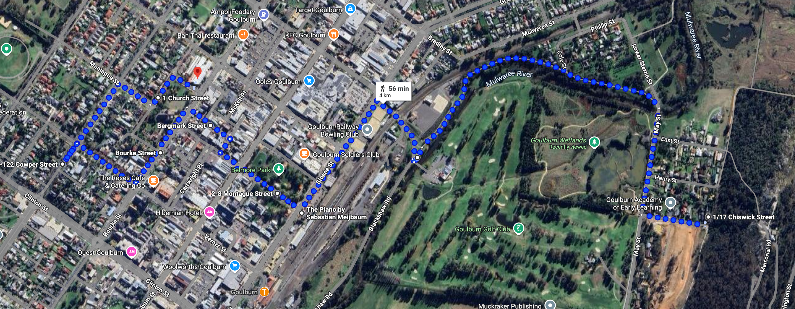 The most recent iteration traced a circuit through Goulburn on Gundungurra land, inviting participants into gestures of listening, movement, and tactile engagement. Pausing at selected locations, text fragments written in response to the site were voiced into place, prompting reflection on the entangled social and environmental forces that define the current climate crisis.