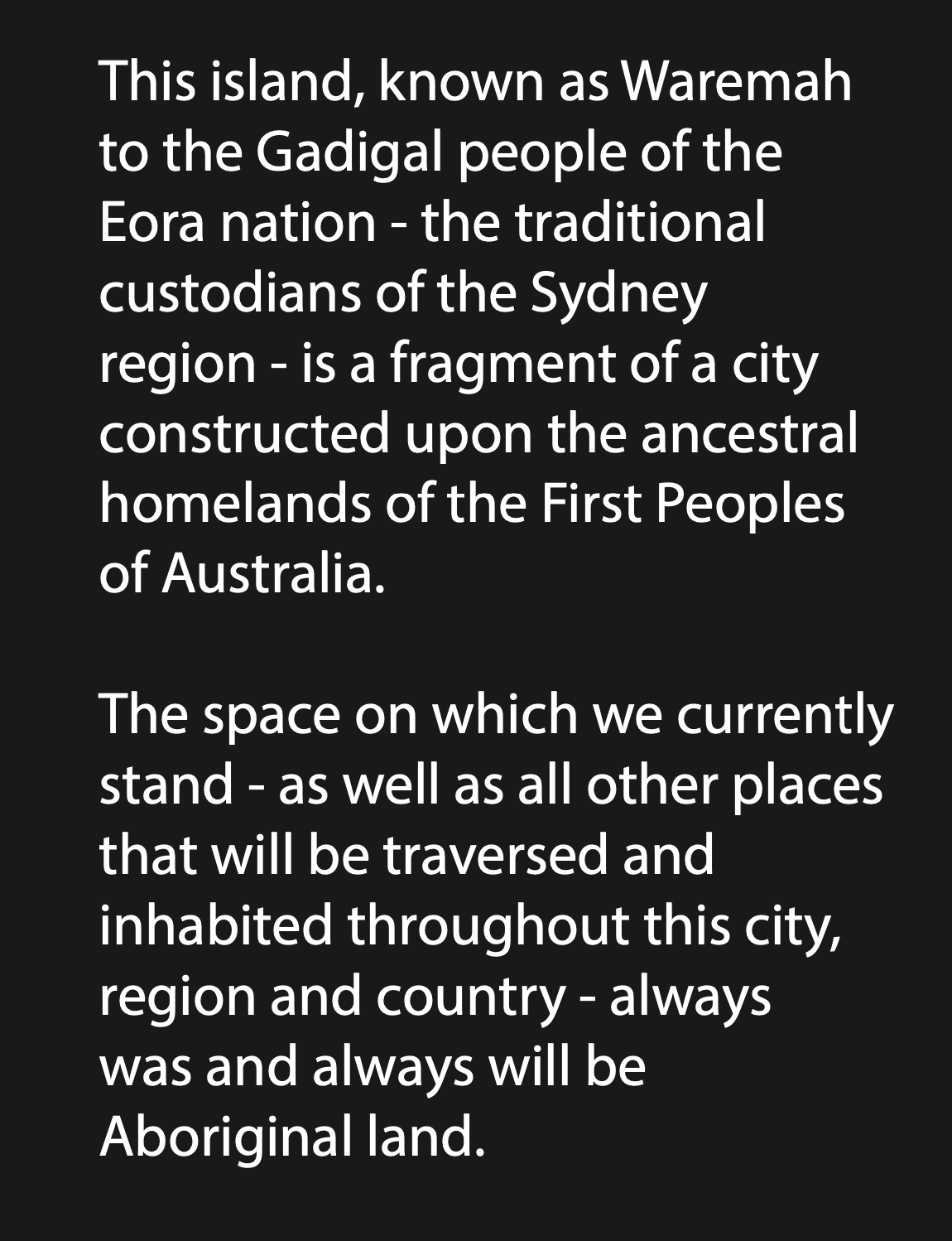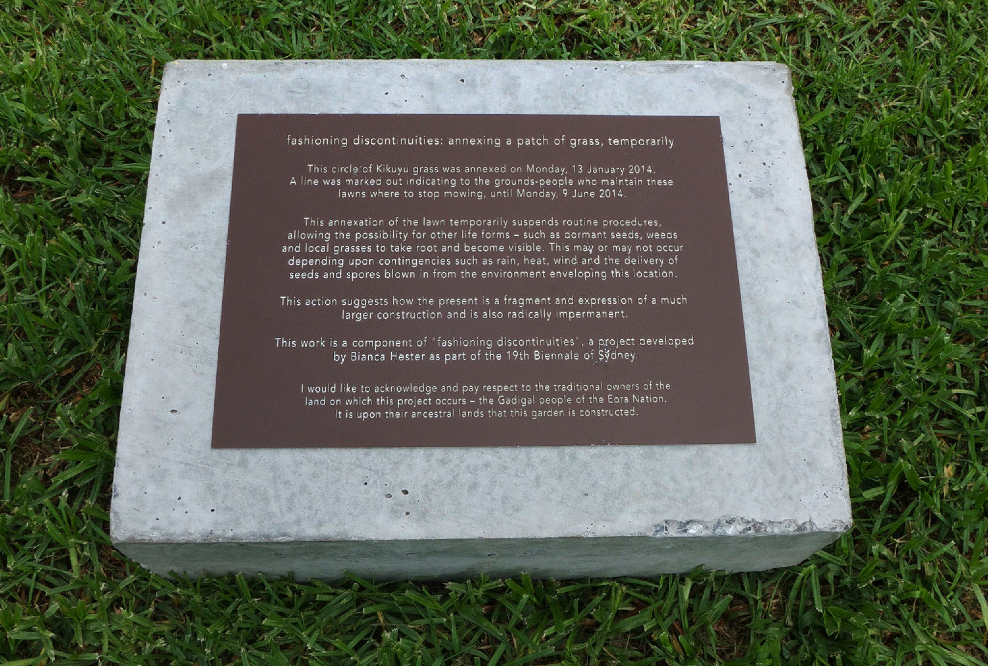 Presented during the 19th Biennale of Sydney, Fashioning Discontinuities involved an exploration in various historic, social and geologic forces shaping urban locations across Sydney. The work employed performative actions and objects to experiment with engaging place otherwise to dominant normative modalities, in ways reflexive of colonial inheritances on Gadigal land. The project both traversed — and was publicly distributed across — a set of sites including Hyde Park, the Botanical Gardens, St Mary’s Cathedral, a footbridge in Woolloomooloo, the Camperdown Cemetery and fragments of the remnant iron-bark forest in Western Sydney.
