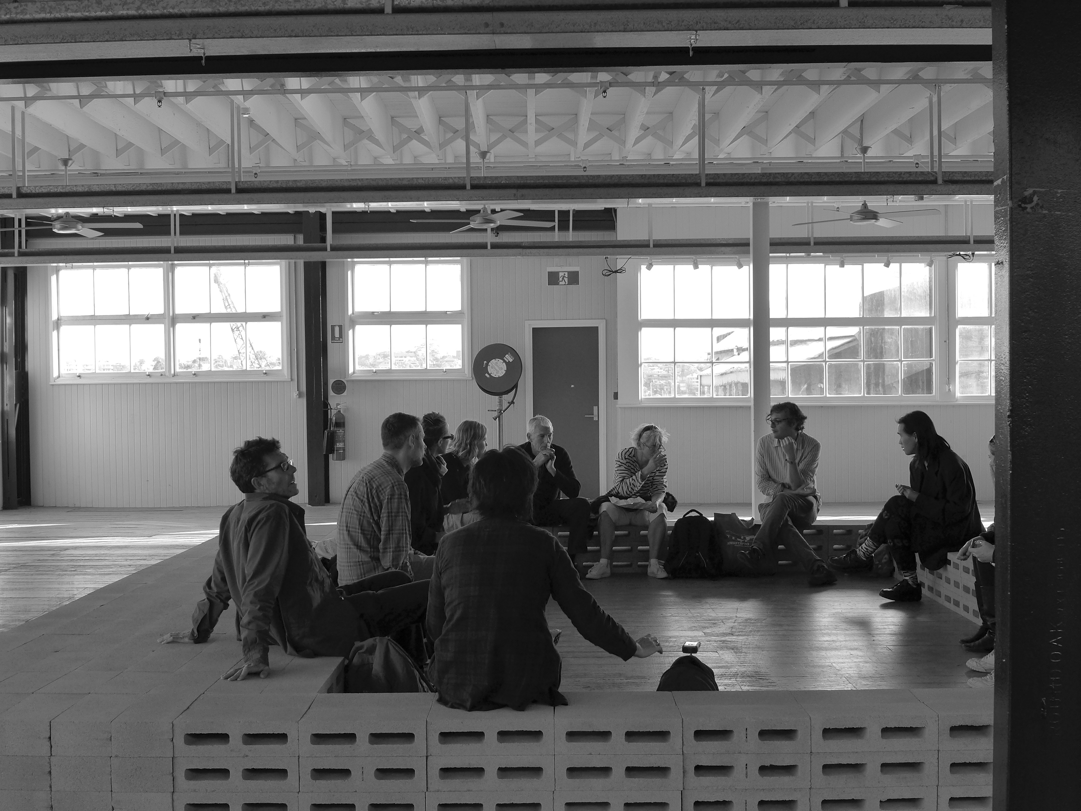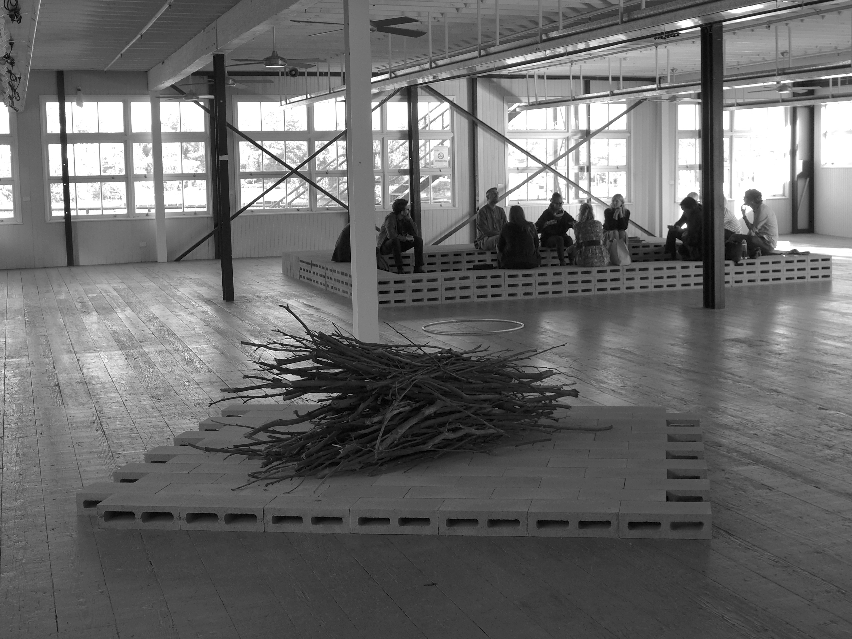 Present politics was a temporary pavilion constructed within the work’s installation venue in Building 6 on Cockatoo Island, for one-to-one and small group discussions, as an intimate localised response to the political climate surrounding the 19th Biennale of Sydney involving the ethics of it’s funding arrangements and its protest by artists involved (including myself). The cinder-block construction functioned as a ‘holding-space’ for improvised discussions related to art as a contested site of politics, corporate sponsorship, the relentless privatisation of the public realm, the inescapable relation between capitalism and art, and the ways artists might experiment with engaging collectively and structurally in the shaping of culture. Audiences were invited to intervene and open up tangents. This forum was held every Friday afternoon at 2pm throughout the Biennale on the following dates: